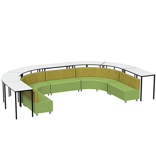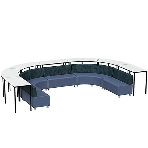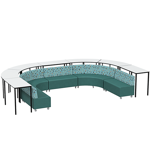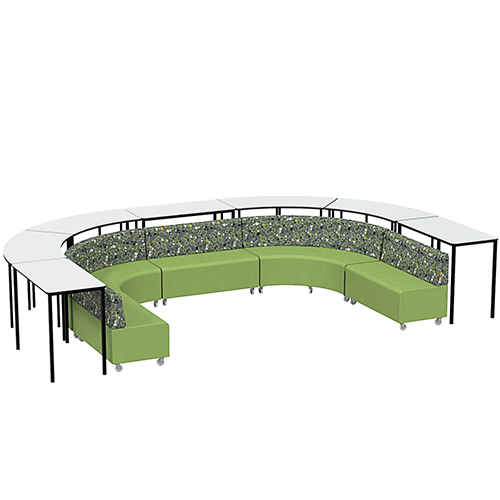 Take your classroom to the next level with a Quad Elevation Package. The Elevation Package includes Quad Caves, Quad Banq 1200, Standing Octave and Hercules Standing 1200 tables. This package will accommodate up to 24 students, making it ideal for larger learning spaces. Tables and seating have a modular design, allowing for flexible layout options. Link tables together to create snaking patterns or position in a circular shape for focused learning. Choose from 12 colour combinations, or select ‘Custom Colour’ for more options. If you would like an alternative fabric or table top colour, let us know and we’ll tailor a package just for you.