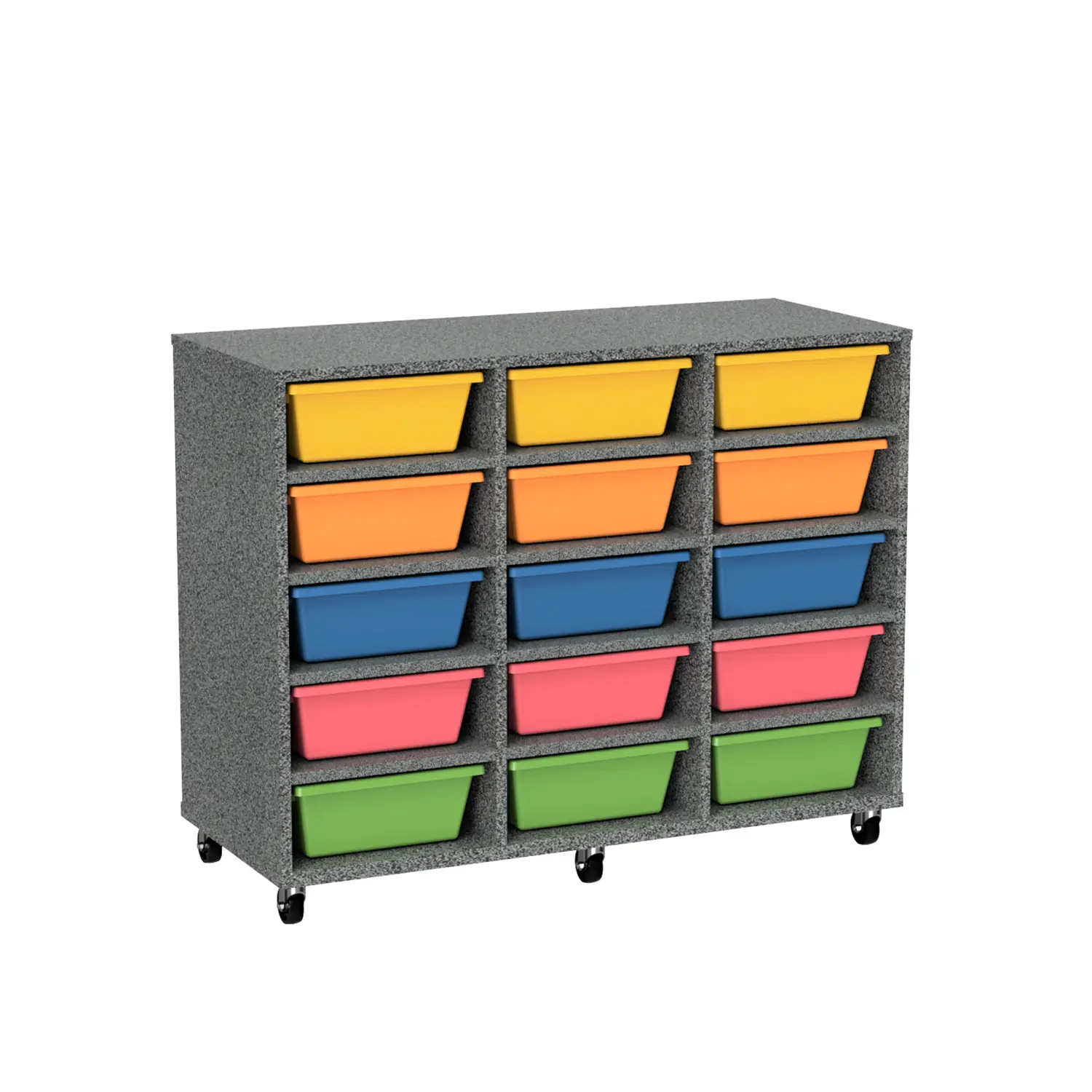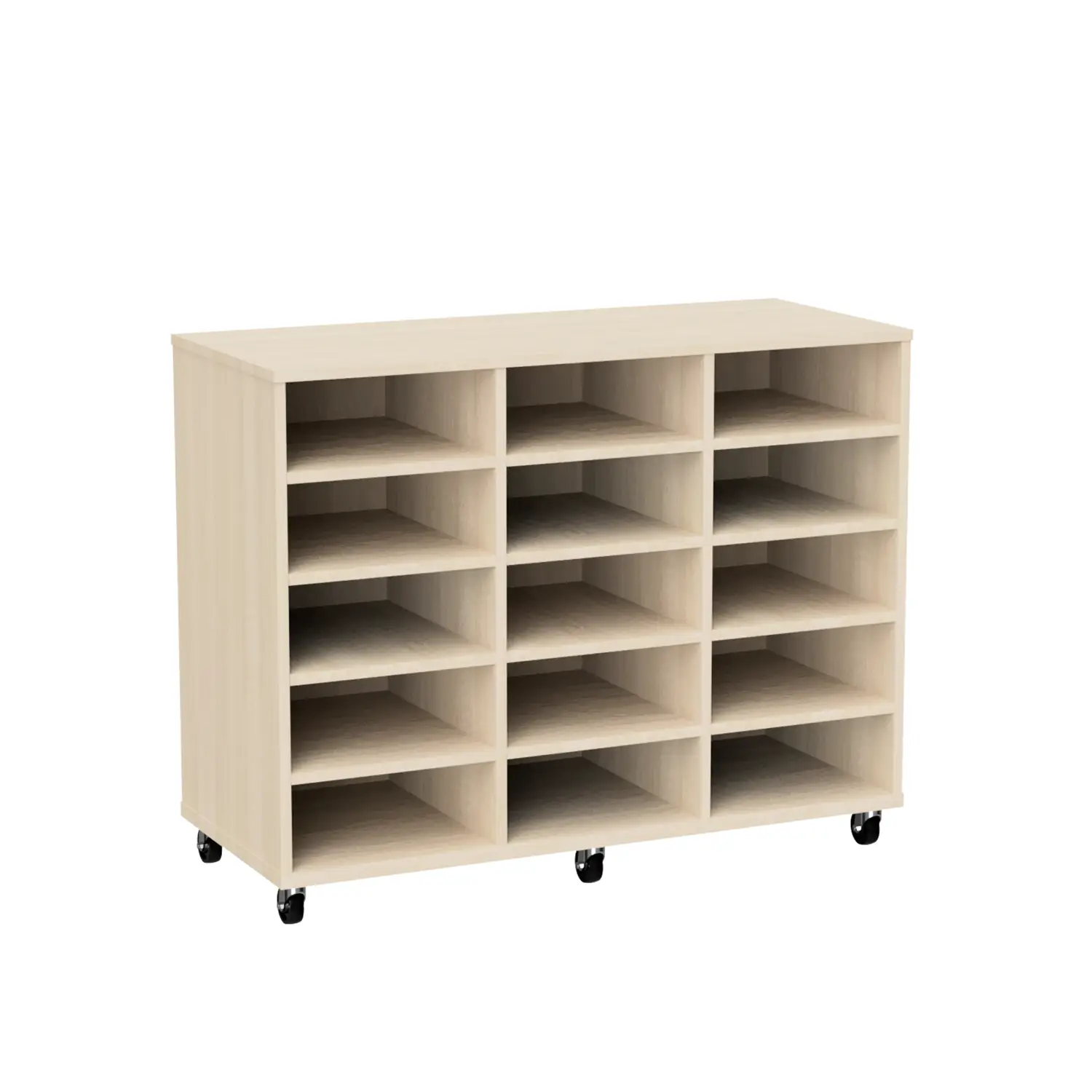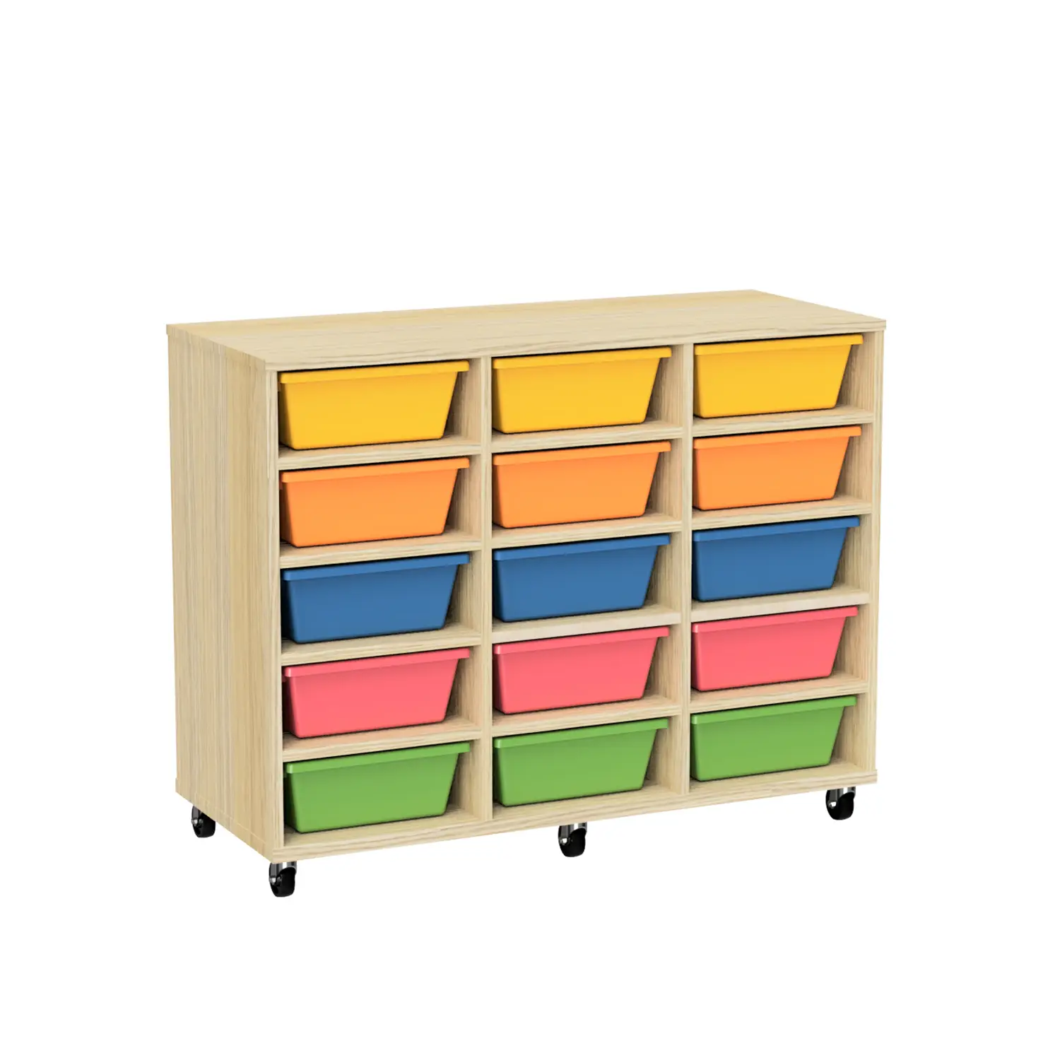 Keep classrooms organised with the Tote Trolley 15. Units feature 15 tote box compartments for easy storage. Featuring heavy duty castors, units are easy to move on both carpet and floorboards. Made from MDF board, trolleys are suitable for high use learning environments. Tote units are currently available in Riverstone, Canadian Maple or Natural Oak. SFX Tote Boxes are optional for added storage and functionality. Tote boxes provide quick access to high use items such as text books, tablets and writing utensils.  As a result, students can work more effectively, saving time and space. See our Tote Trolley 10 for more storage options.
