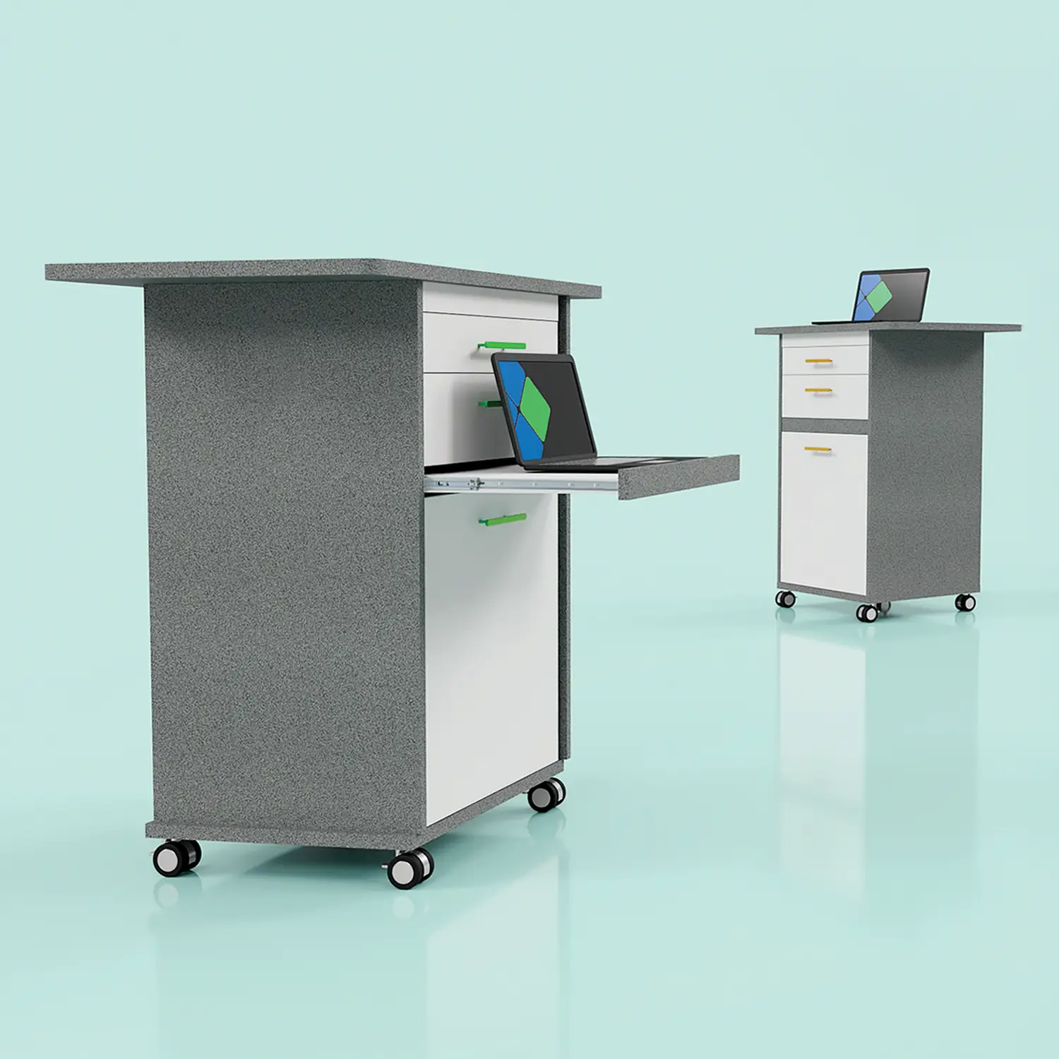 Get mobile with the Vision Teacher Station. Developed exclusively by Schoolfurn, the Vision is a mobile lectern designed for dynamic learning environments. Units feature heavy duty castors and a large work surface. An additional pull-out surface provides room for books, laptops and tablets. Units feature a cupboard with an adjustable shelf for utensils and supplies. Designed for both standing and seated work, the Vision can be used as a mobile desk or presentation podium. Drawers feature soft close runners and your choice of colourful hardware. Get mobile by complementing your Vision Teacher Station with a Mobile Porcelain Whiteboard.